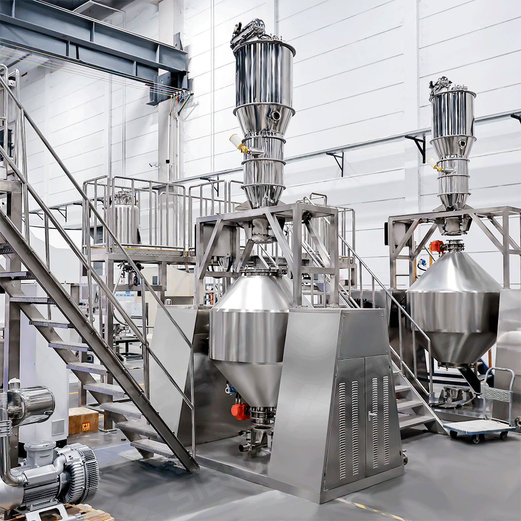 混合干燥系统:核心设备为双锥混合机,其筒体采用独特的W型结构,通过旋转实现物料的高效均匀混合,无出料死角,尤其适用于混合均匀度要求高的工艺场景。设备配备高自动化气动对接装置,筒体旋转至上方可自动、精准对接完成进料,旋转至下方则自动连接出料系统,大幅减少人工干预,提升生产自动化水平与操作安全性。此外,混合机采用双侧输入的创新设计,喷液系统与加热介质入口等均可从两侧接入,与进料口互不干扰,进一步提高运行效率。同时,配备加热夹套和真空冷凝系统,高真空密闭环境有效降低液体沸点,实现低温高效干燥;配套的冷凝回收装置则将蒸发的溶剂集中回收处理。
