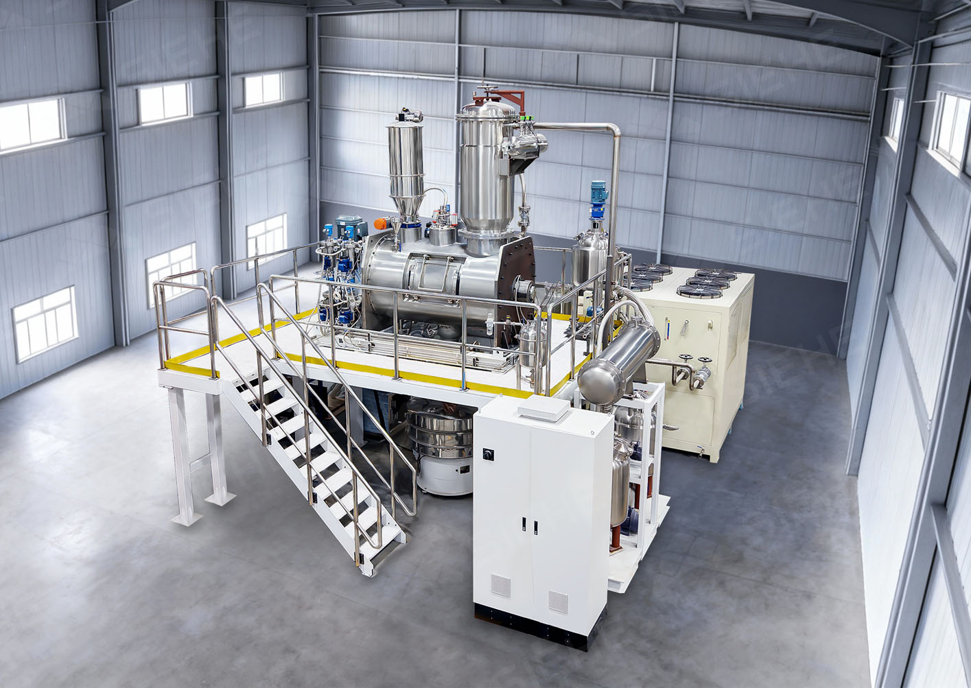 本次交付的卧式犁刀真空干燥系统,涵盖粉体拆包与输送、液体自动配料、混合干燥、智能控制、CIP清洗及温控配套机组等多个核心单元,以紧凑布局实现高效、洁净、稳定的工艺流程。